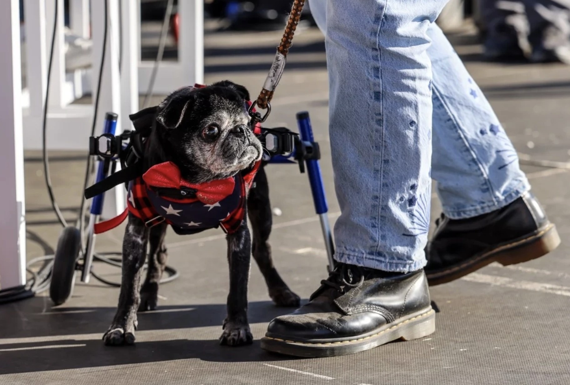 Chú chó Rome, người về nhì cuộc thi chó xấu nhất hành tinh, ngồi trên xe lăn.