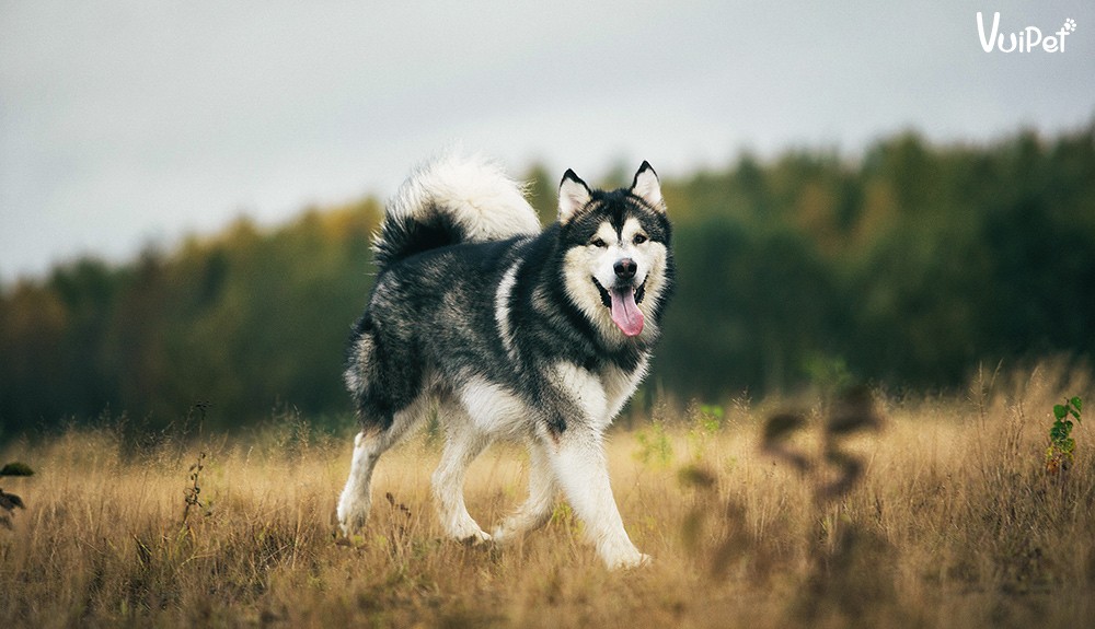 Một chú chó Alaska với bộ lông đặc trưng đang sải bước trên bãi cỏ, thể hiện sự mạnh mẽ và yêu thích vận động
