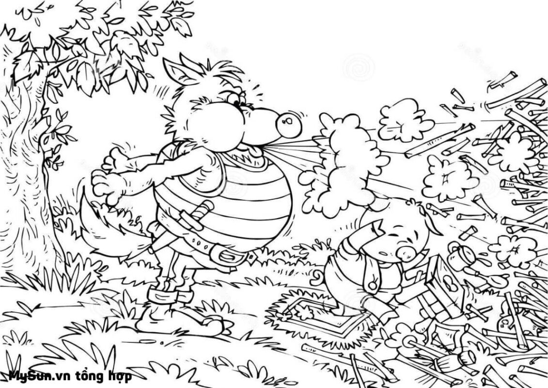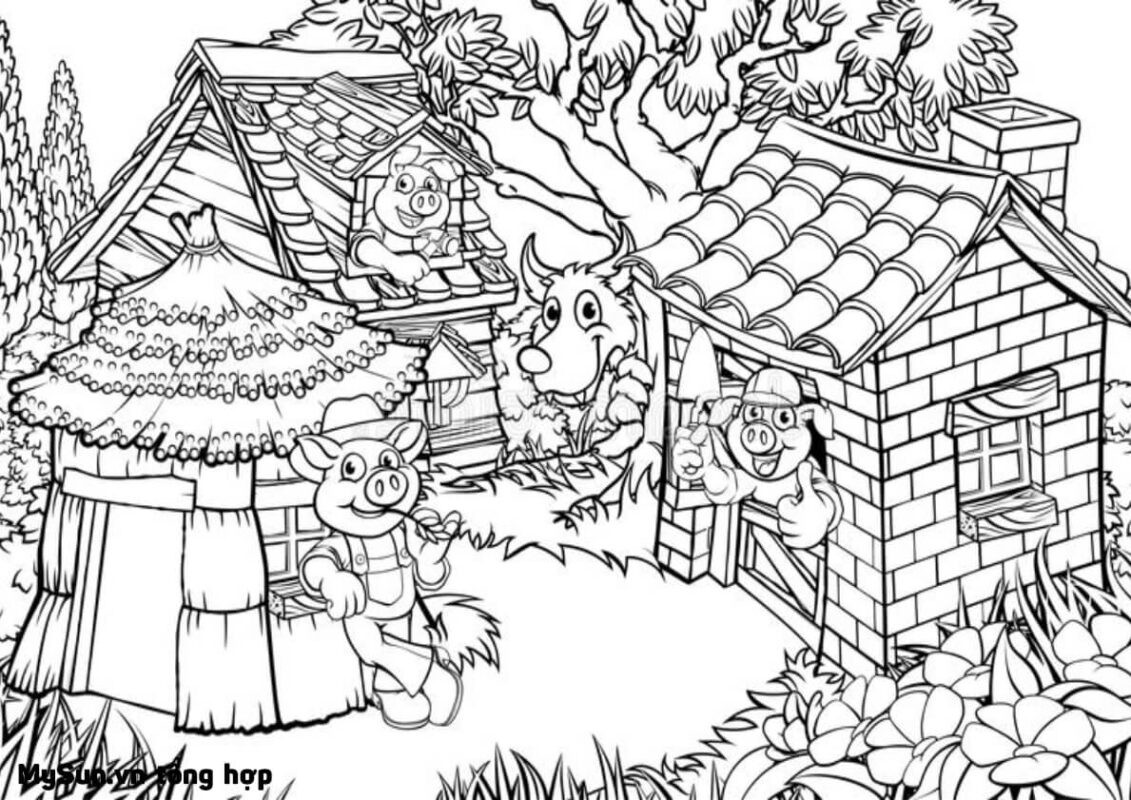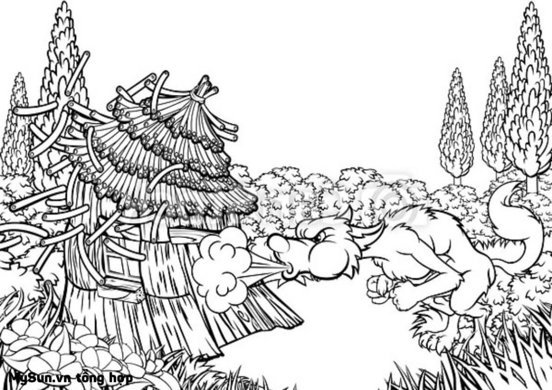 tô màu truyện cổ tích con chó sói già và ba chú heo con