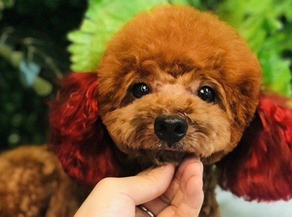 Chó Poodle con màu nâu đỏ đáng yêu đang nằm trên tay, kết quả của quá trình phối giống thành công